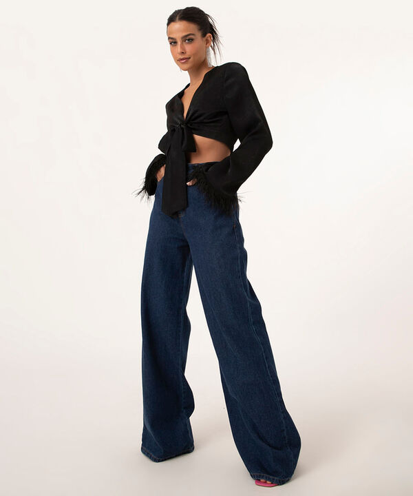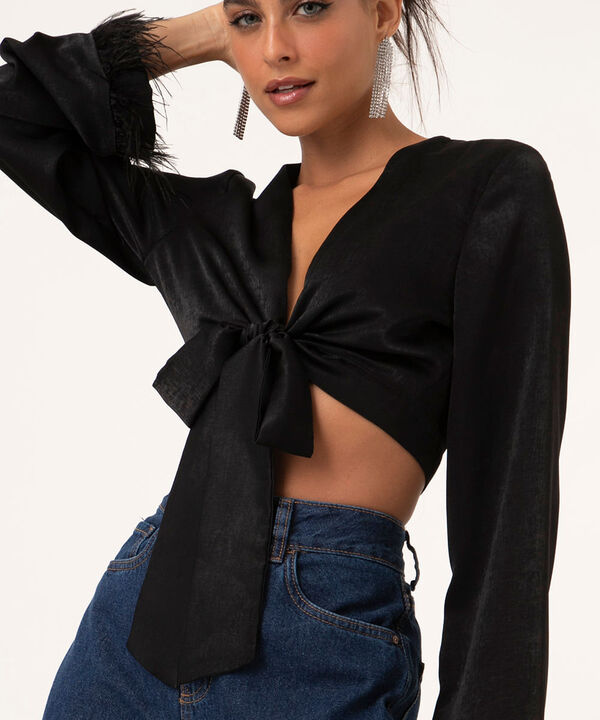 blusa cropped de cetim com plumas e amarração preta